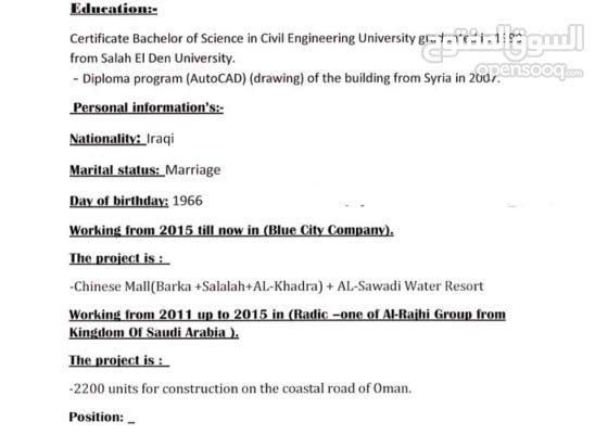 مهندس ابنيه مدني خبره في تنفيذ واشراف المباني 11 سنوات بالسلطنه 130420692 السوق المفتوح